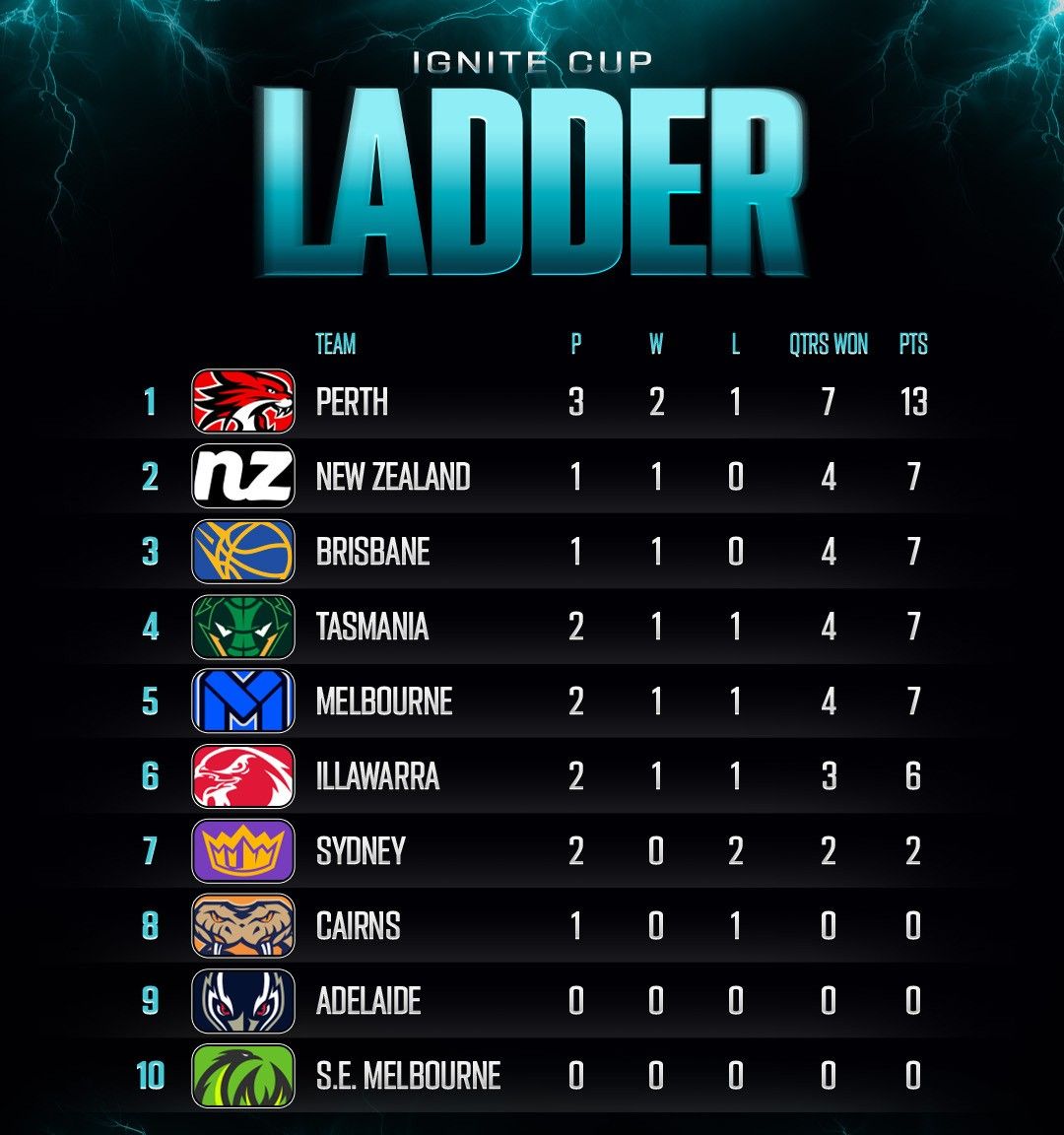 Ignite Cup采用世界首创的全新天梯积分系统,从而竞赛会更加刺激。 每场获胜的球队将获得3个积分,每赢得一节的球队也会获得1个积分。如果两队单节的得分相同,则每队获得0.5分。 ”