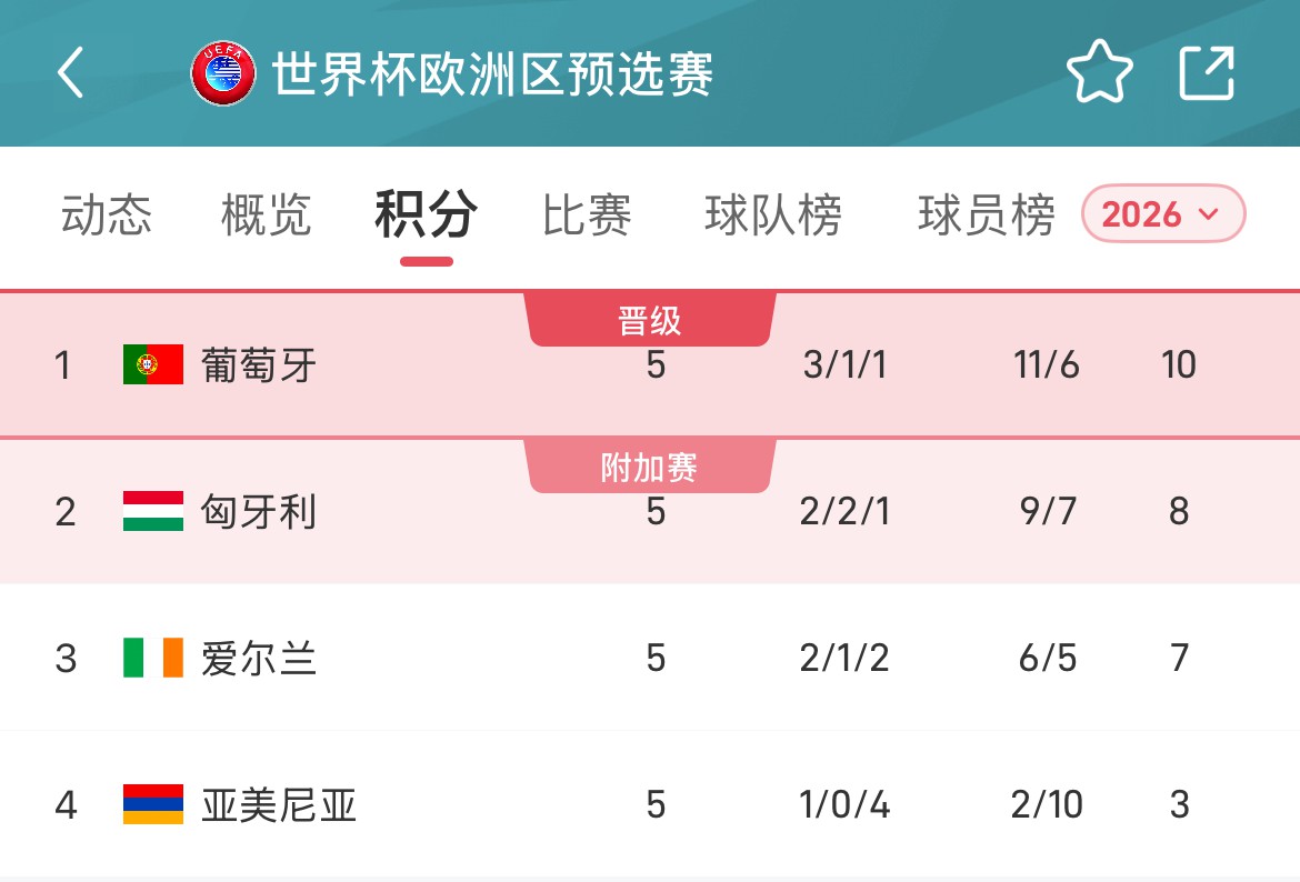 目前F组的出线形势仍存变数,葡萄牙3胜1平1负积10分,虽然在小组积分榜中独占鳌头,但领跑位第二名匈牙利仅有2分,小组第三爱尔兰也有7个积分。也就是说,如果葡萄牙在最后一场竞赛中意外翻车,甚至被对手逼平,都极有可能在最后一刻被身后的两个对手实现逆袭。
