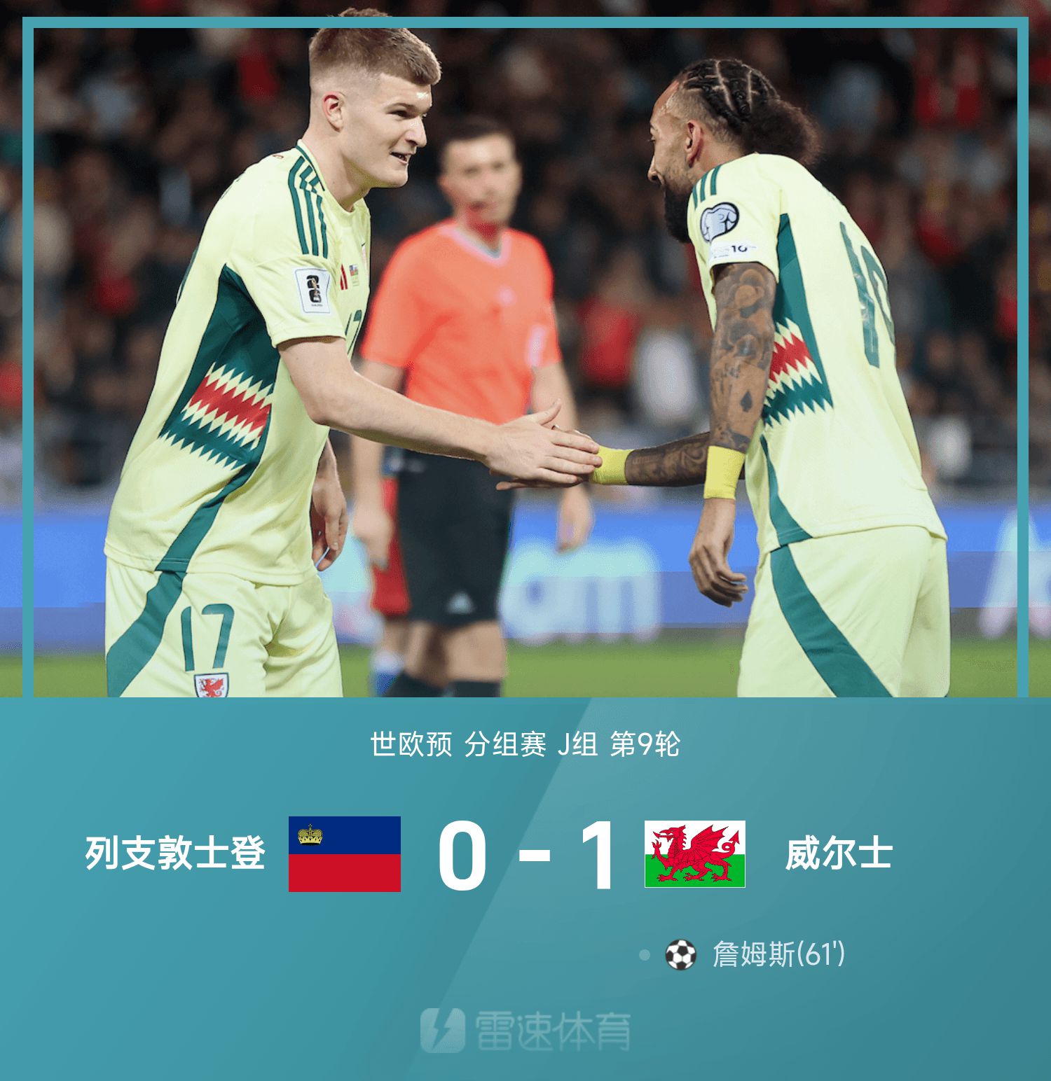 6686体育app11月16日讯 26赛季世欧预分组赛J组第9轮,列支敦士登坐镇主队场迎战威尔士。上半场,布罗德黑德破门,裁判员介入视频裁判判定进球无效。下半场,第61分钟,詹姆斯破门打进全场唯一进球锁定战局。最终,威尔士1-0险胜列支敦士登,威尔士分组赛有望晋级世杯赛名额。