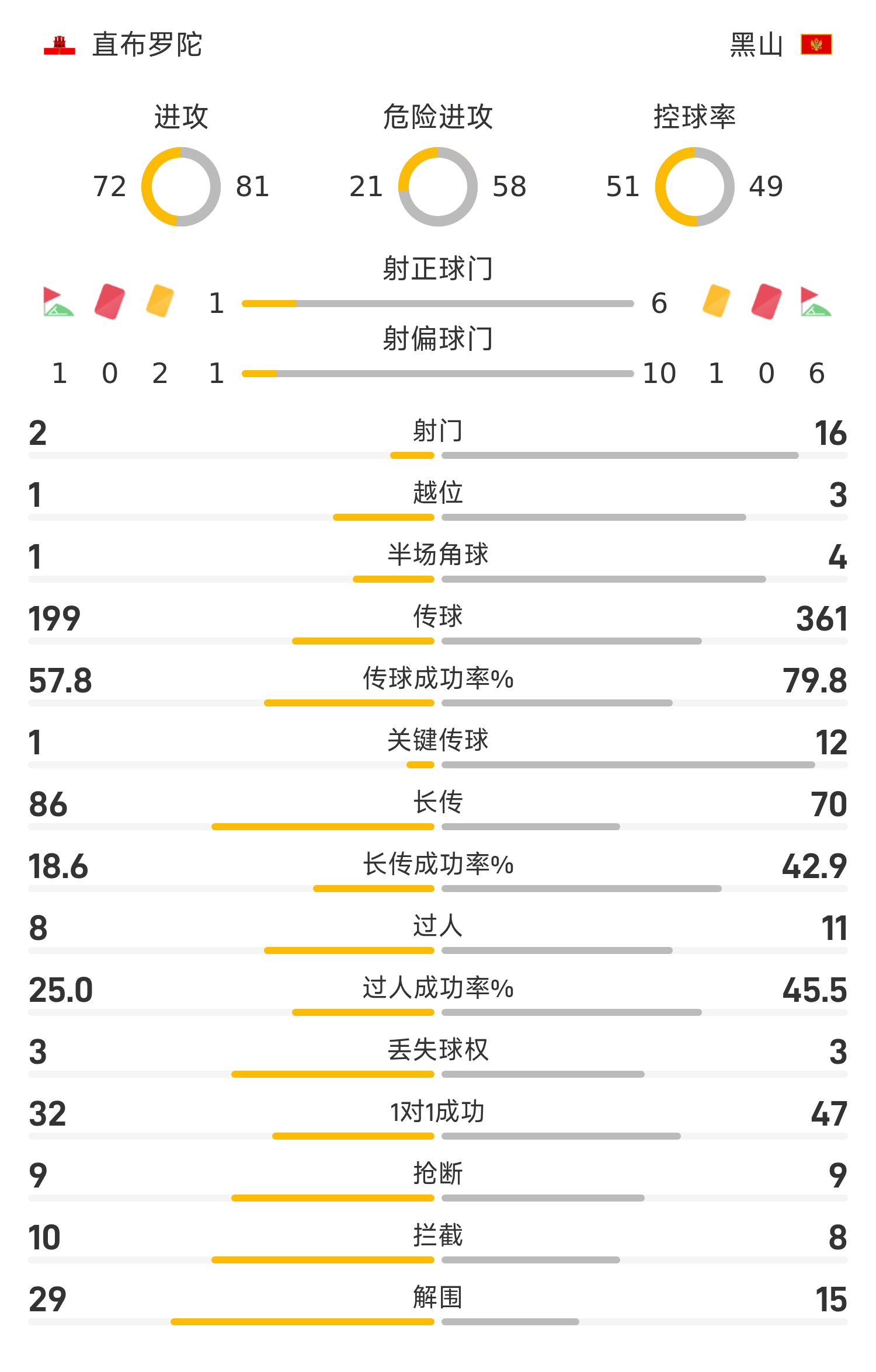 6686体育app11月15日讯 世欧预分组赛L组第9轮,直布罗陀坐镇主队场迎战黑山。此役上半场,杰索普单刀破门,阿季奇主罚自由球建功扳平局赛果分,科斯托维奇点射命中。易边再战,双方均未破门。全场竞赛终结,黑山2-1直布罗陀。