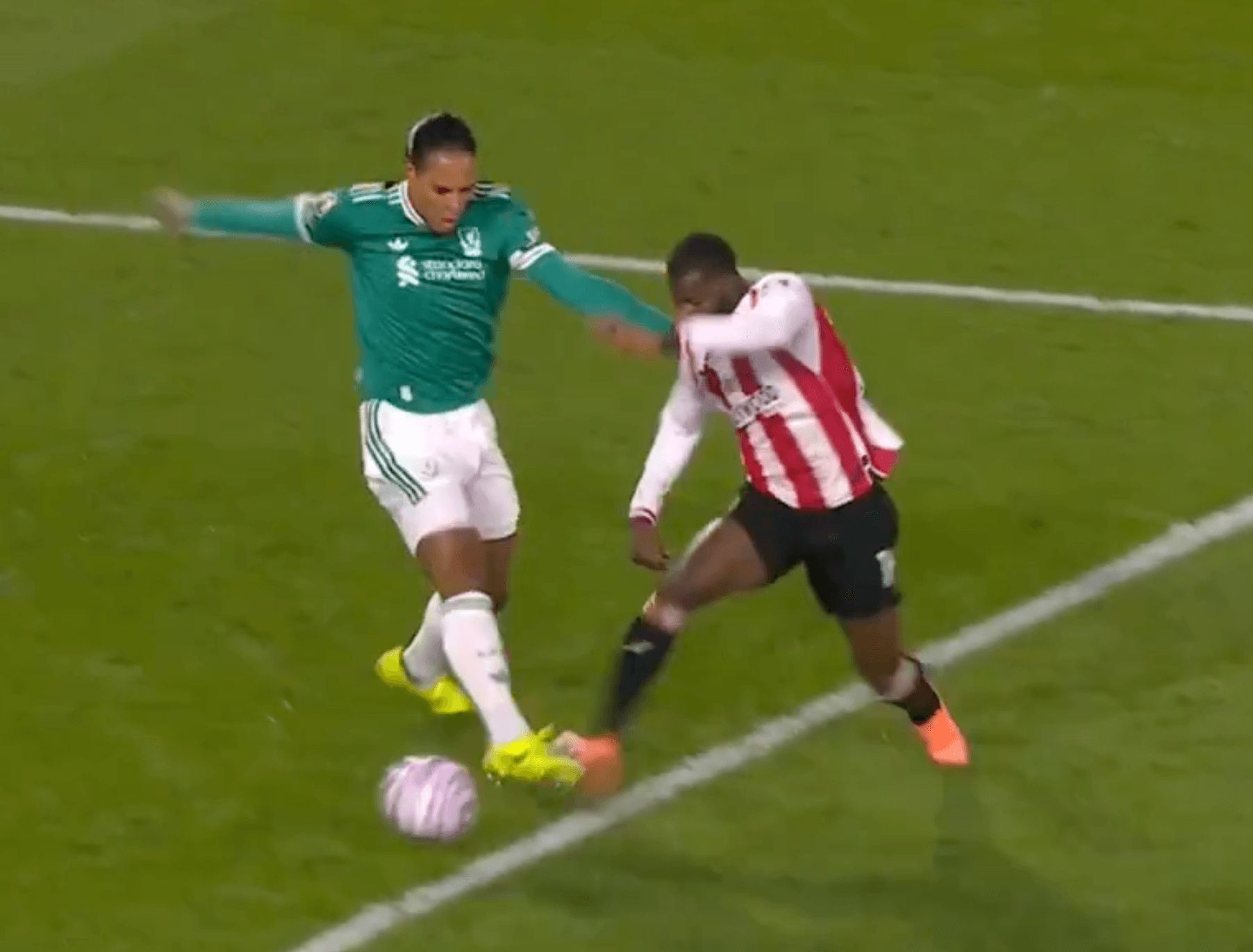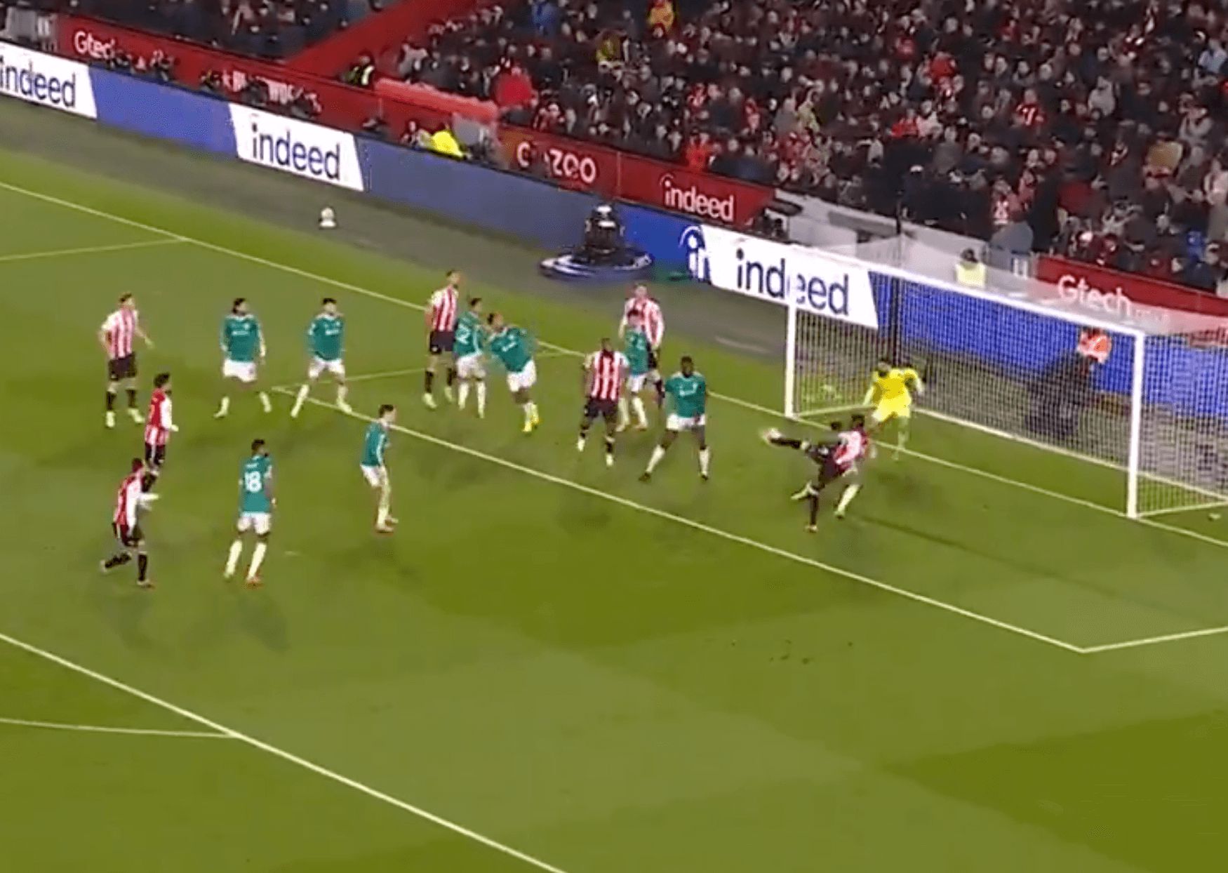 这个进球前发生了一连串混乱的事件。首先萨拉赫在左路对沙德违例,随后达姆斯高拿到球并迫使马马尔达什维利做出救球。布伦特福德将球发展到左路,瓦塔拉突破范戴克后被违例,地点看似在三秒区线外。