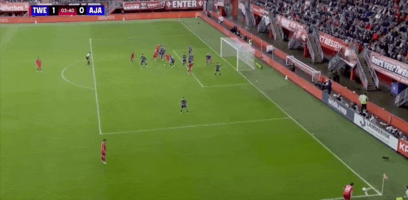 13’特温特开出战略边线球,范沃尔夫斯温克尔后点顶球偏出立柱