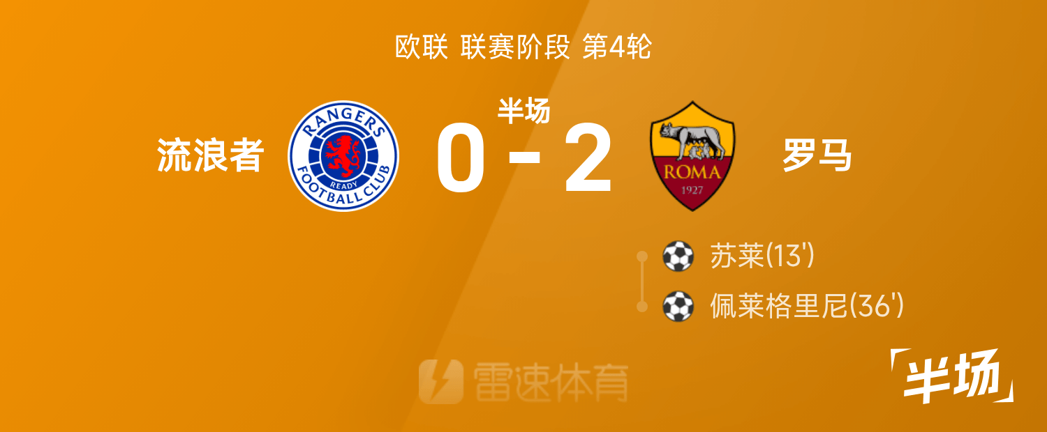 欧联半场:苏莱、佩莱格里尼破门,流浪者0-2罗马