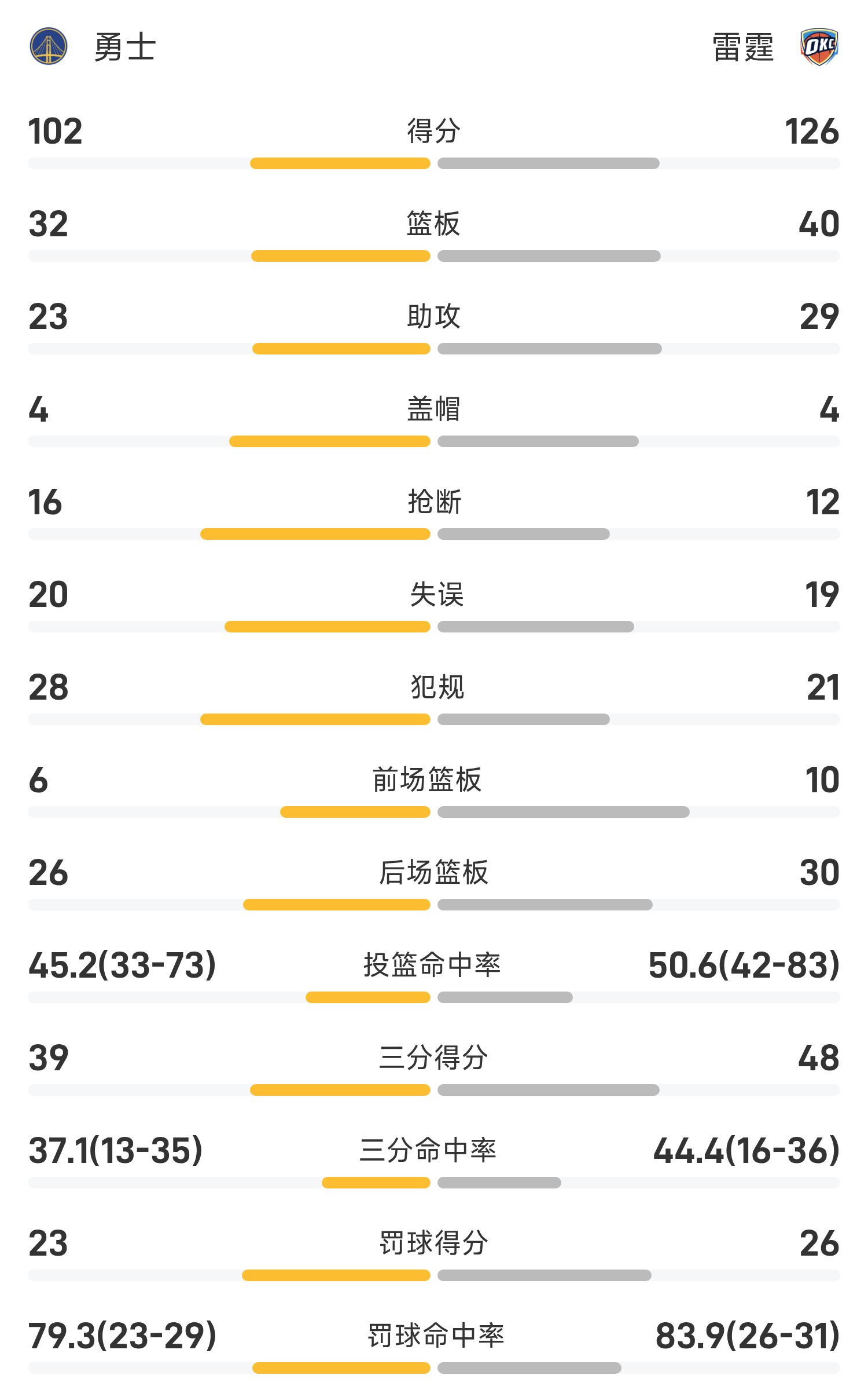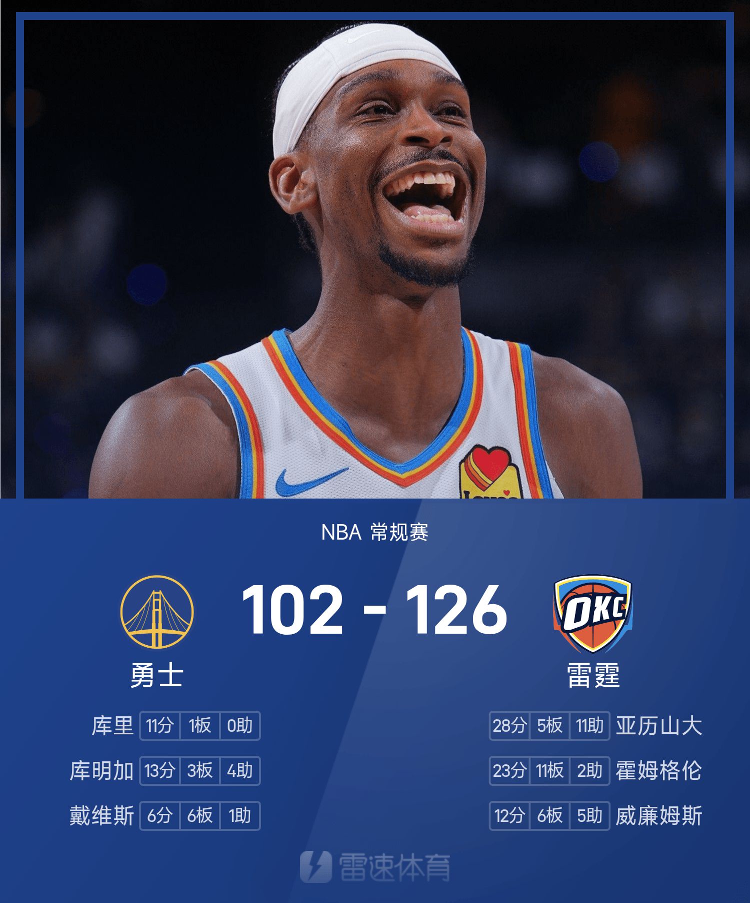 NBA战报:亚历山大28分11助,雷霆126-102大胜勇士