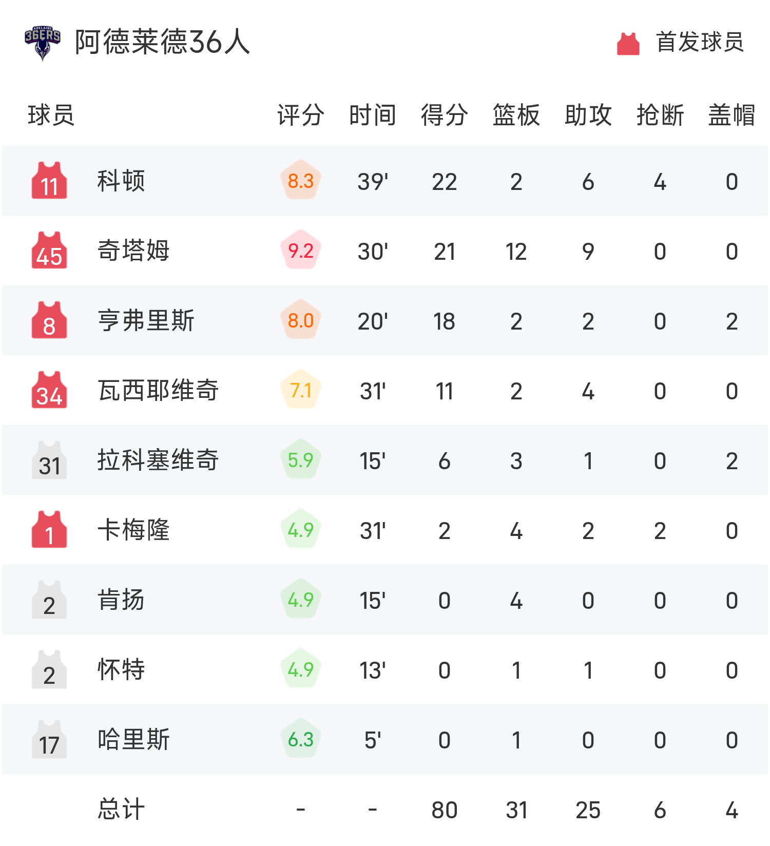 双方全场战罢,墨尔本联81-80战胜阿德莱德36人。