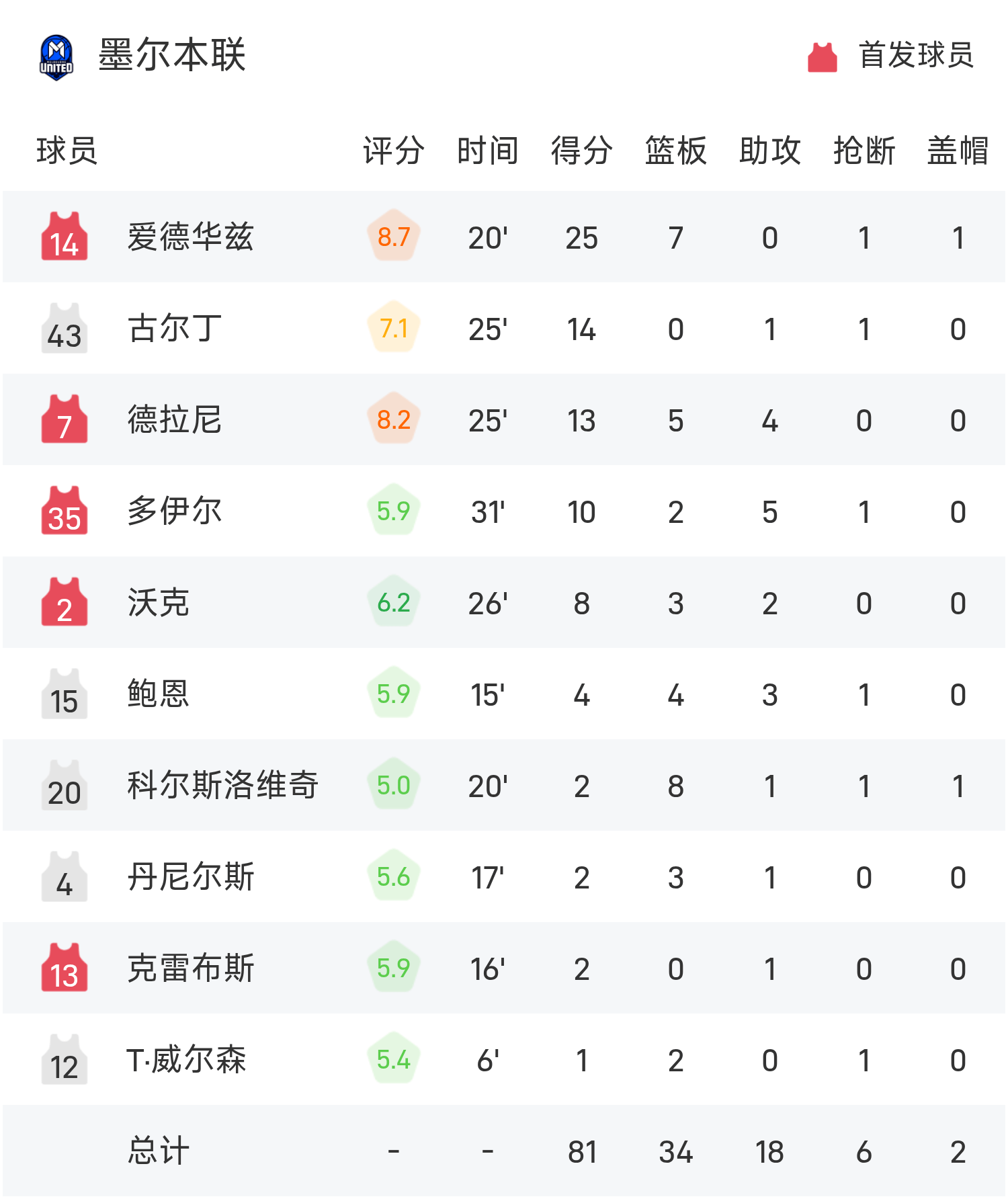 爱德华兹砍下全场最高的25分7板,率领墨尔本联胜利取胜。