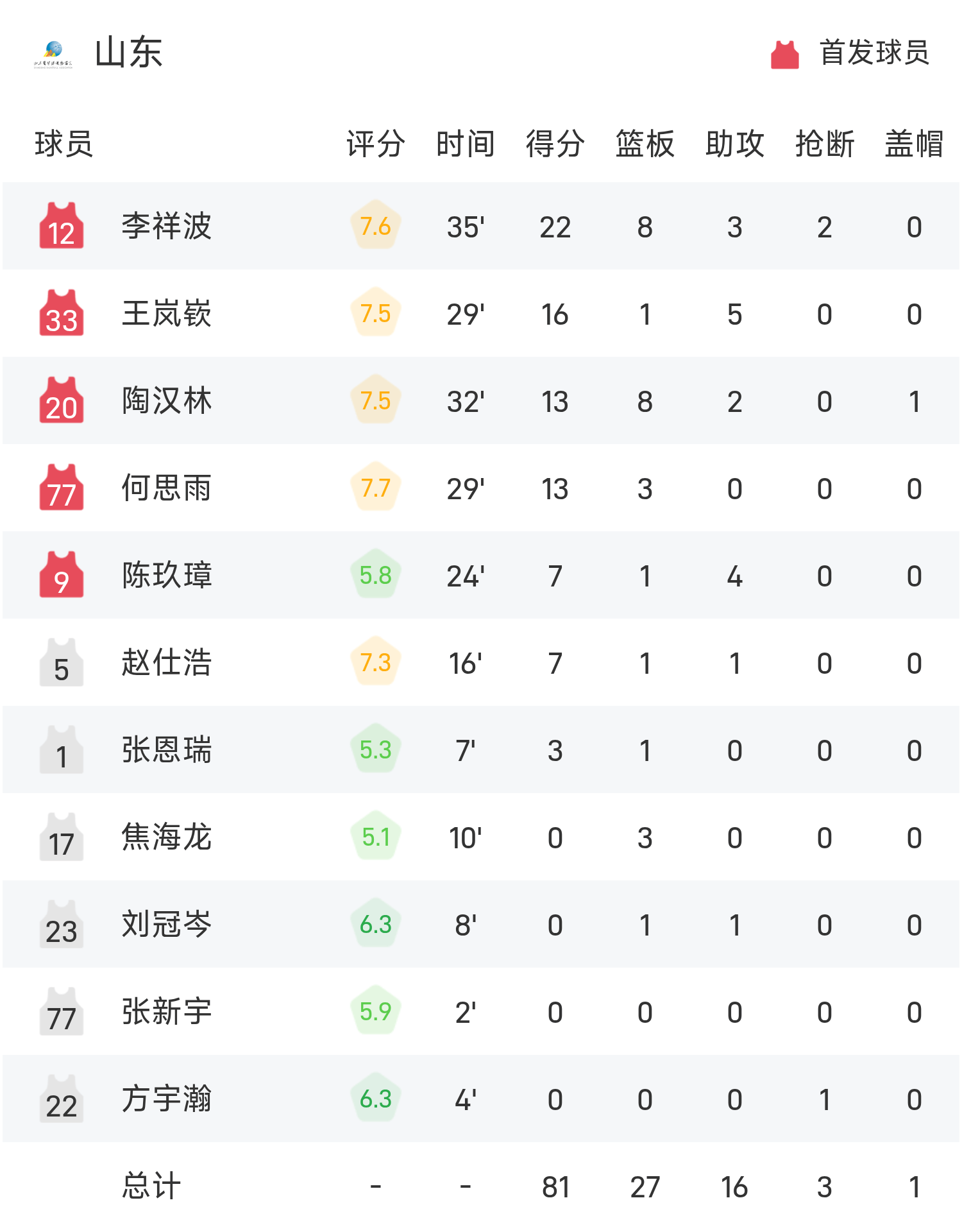 6686体育app11月06日讯 全运男篮分组赛,浙江对阵山东。双方全场战罢,浙江85-81战胜山东。余嘉豪得到18分9板1助率队取胜,李祥波空砍全场最高的22分8板3助。